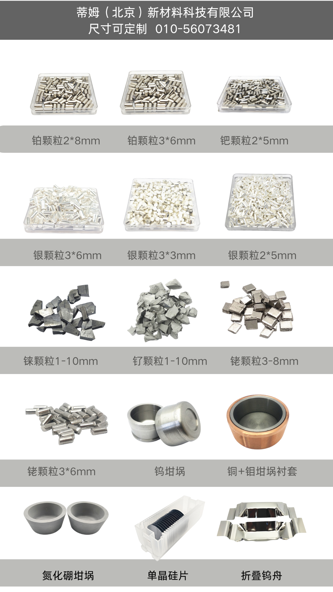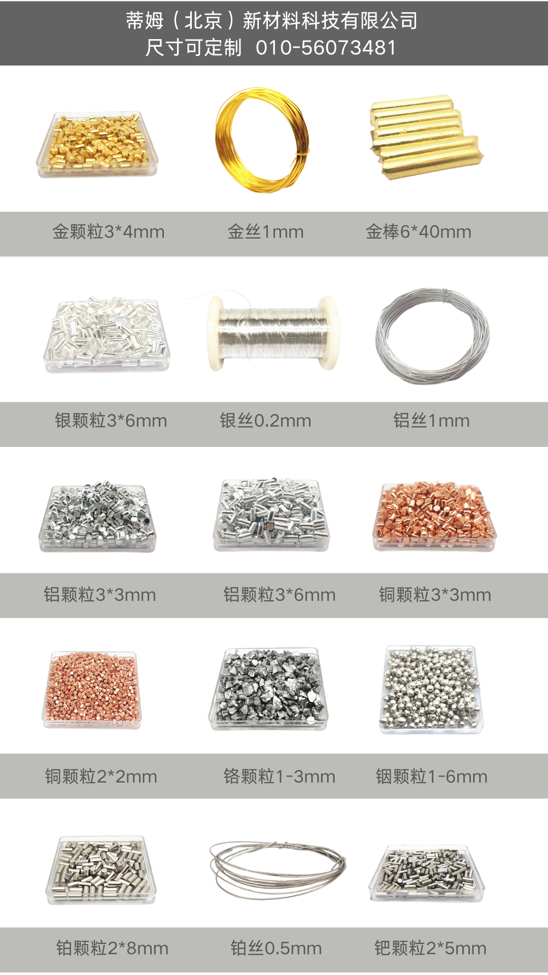 注: 1.贵金属均以成交当日金交所价格为基准,以产品实际重量核算最后金额。 2.以上均为含税含运费价格,13%增值税发票,收货前运输途中风险均由我司承担。 3.溅射/蒸镀的Au/Pt/Pd等贵金属材料,打穿之后可提供回收再加工服务。 4.我司亦可提供MgGd,AlLi,TiZr等合金,可根据需要的成分比例定制。 |
